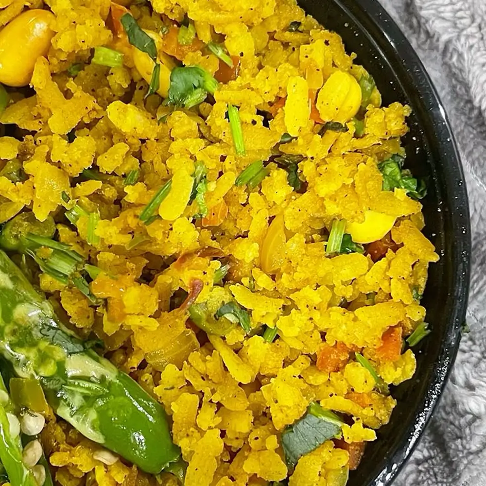 Poha, Onions, potatoes, Peanuts, Green peas, Carrots, Salt, Refined Oil, herbs & Spices